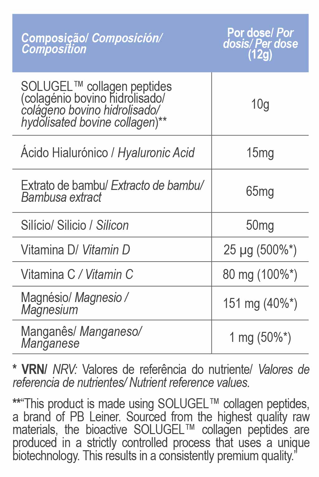 Die Formel enthält patentierte bioaktive Kollagenpeptide namens Solugel®. Es handelt sich um eine hochwertige Form hydrolysierten Kollagens mit kleinen Kollagenpeptiden vom Typ I und Typ III. Die Formel ist außerdem mit Hyaluronsäure angereichert, einer der wichtigsten Verbindungen zur Erhaltung von Hautfeuchtigkeit und -volumen, sowie Silizium, einem wichtigen Mineral für die Kollagenproduktion, und kollagenschützenden Nährstoffen wie Vitamin C, Vitamin D, Magnesium und Mangan.