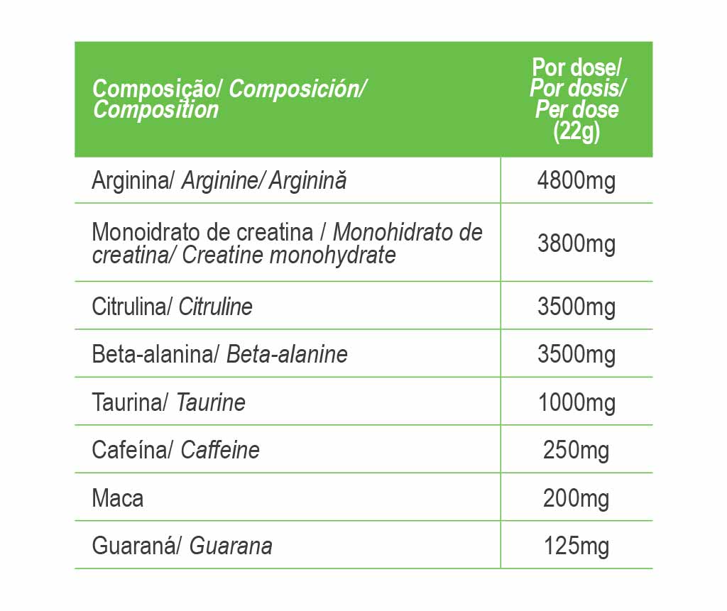 Auswirkungen vor dem Training Unterstützt die Muskelregeneration und verzögert die Ermüdung, sodass Sie beim Training maximale Leistung bringen. Kombiniert L-Arginin (Vasodilatationsverstärker), Koffein (ergogene Wirkung) sowie Maca- und Guarana-Pflanzenextrakte, die eine stimulierende Wirkung haben, die körperliche Widerstandskraft erhöhen und das Müdigkeitsgefühl verringern.